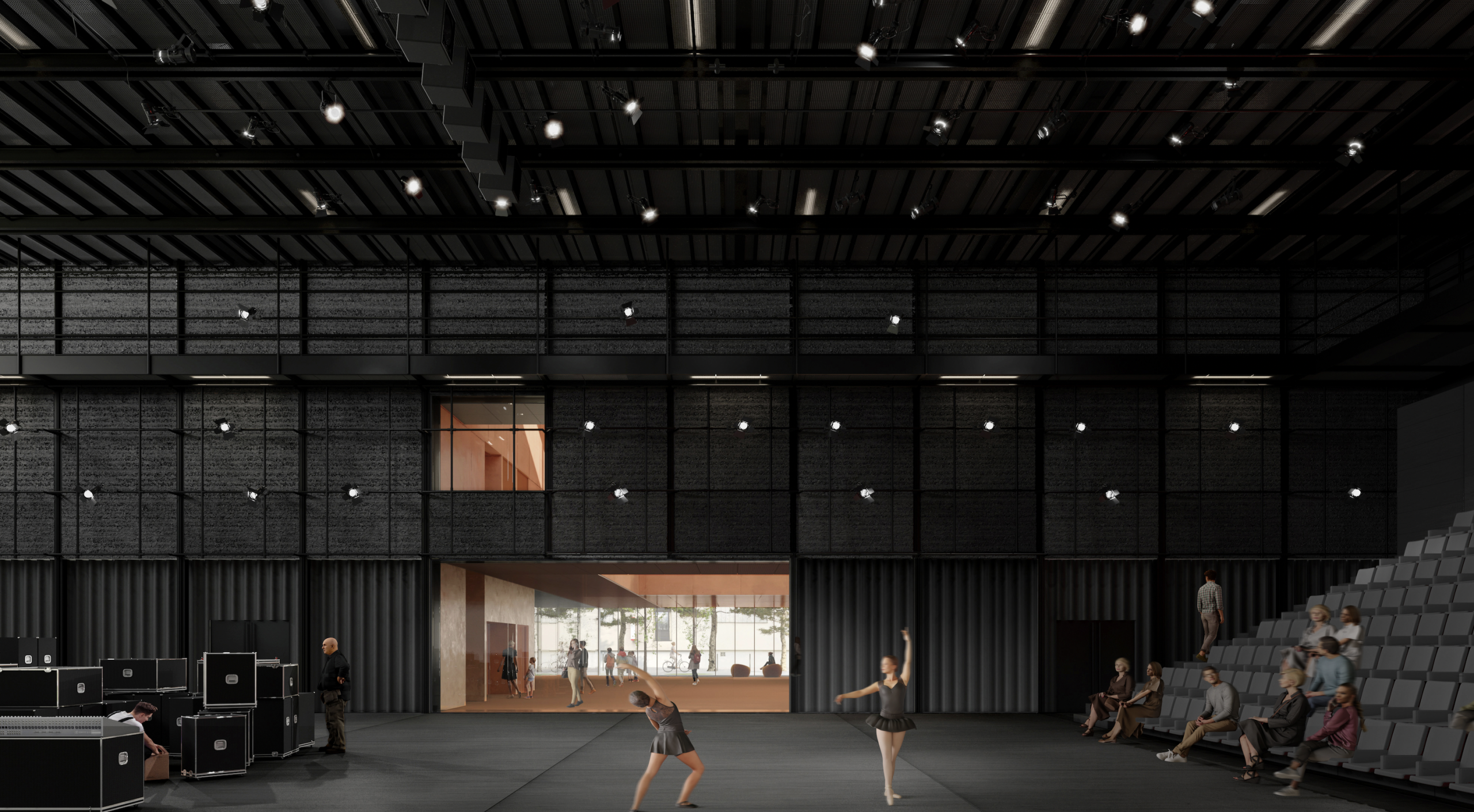–Le studio 2 de 12 mètres de hauteur, lui, de 450 places pour le public comportera en fond de scène une paroi coulissante qui permettra d’ouvrir l’espace et d’en doubler sa superficie. Ainsi, l’espace pourra être utilisé comme lieu de spectacle ou pour des réceptions.