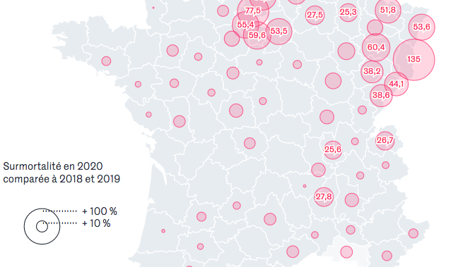 La carte ci-dessus représente l’excès de mortalité mesuré par l’Insee entre le 1er mars et le 10 avril 2020 comparée à la moyenne des décès observés durant la même période en 2018 et 2019.