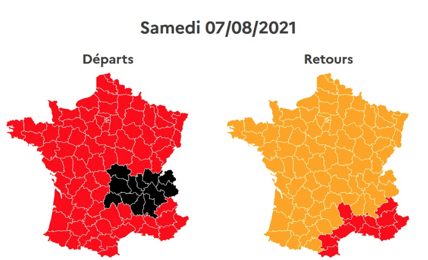 Le drapeau noir est en effet hissé par Bison Futé pour samedi en Auvergne-Rhône-Alpes dans le sens des départs. Le reste de l’Hexagone est peint tout-de-même en rouge..!
