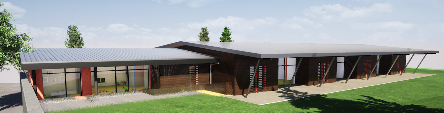La salle de jeu sera largement vitrée sur les espaces arborés du sud et se prolongera sur une terrasse en bois.