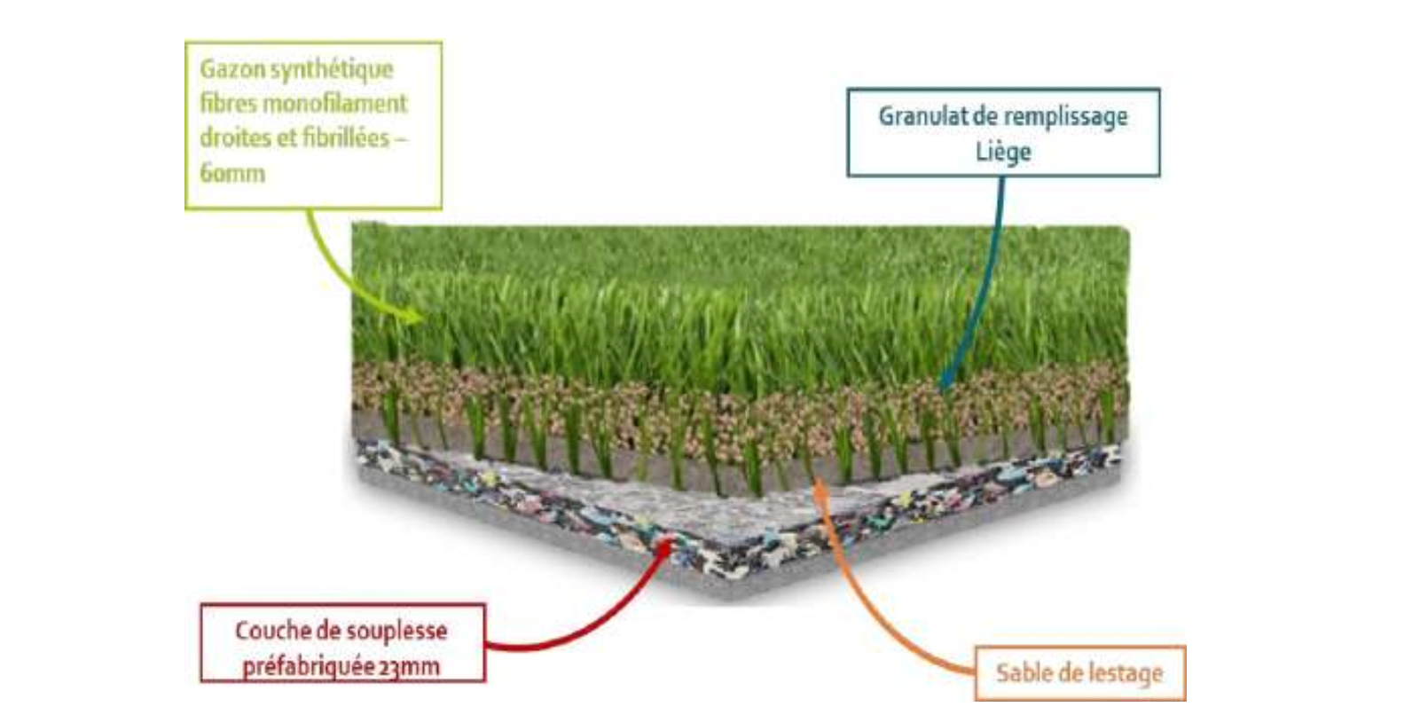 Sans trop rentrer dans les détails techniques, ce nouveau terrain va se révéler tout à fait adapté au rugby puisque l’avant dernière couche sous le gazon synthétique lui-même, visant à amortir les chocs, est composée de 22 millimètres matériaux issus du réemploi : le granulat « de confort » est composé d’éléments naturels à base de liège. » (photo ci-dessous)
