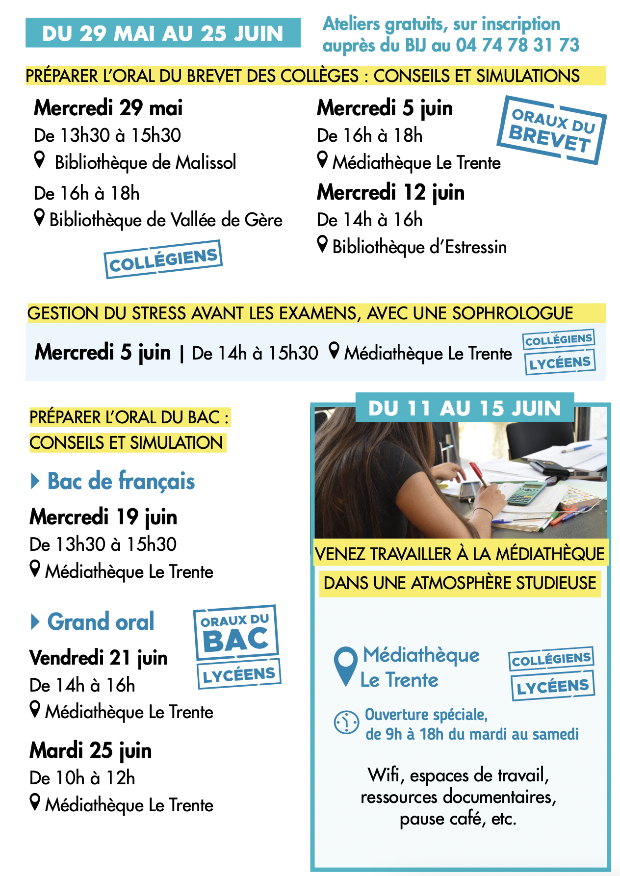 La Médiathèque Le Trente, en lien avec le Bureau Information Jeunesse Ville de Vienne, propose cette année encore le dispositif « Bosse tes exams » du 29 mai au 25 juin pour aider les collégiens et lycéens à préparer à leurs futurs examens.