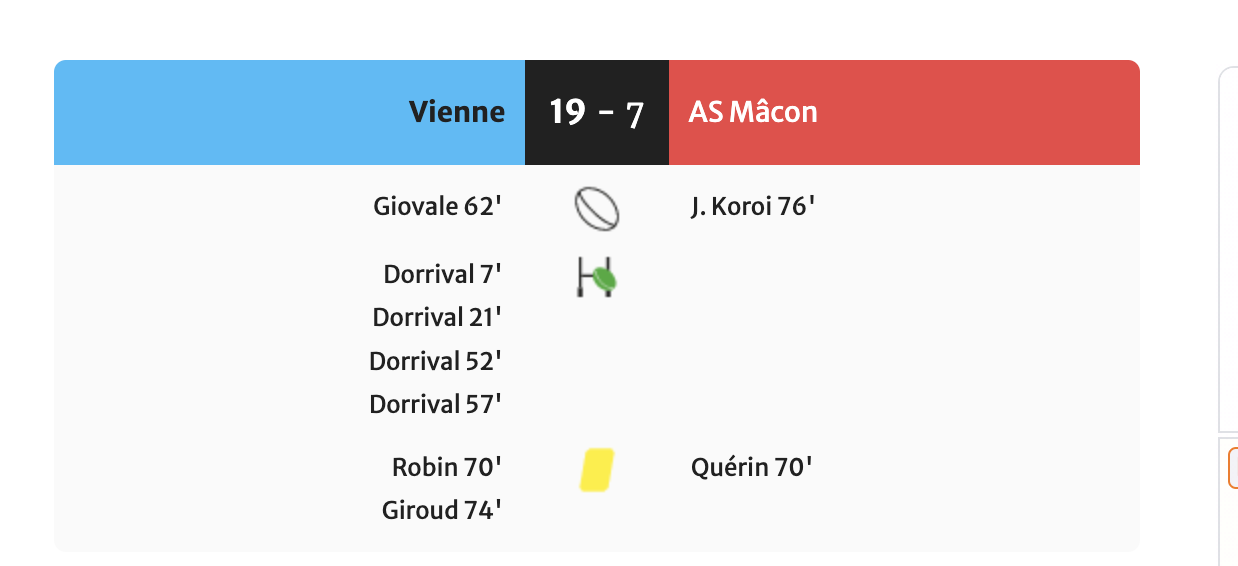 Suite à un carton jaune adressé à Giroud, les Viennois qui se retrouvent à 13 contre 14, alors en difficulté à proximité de leurs poteaux, voient Mâcon marquer à la 66ème minute, son premier essai, aussitôt transformé (19/7).