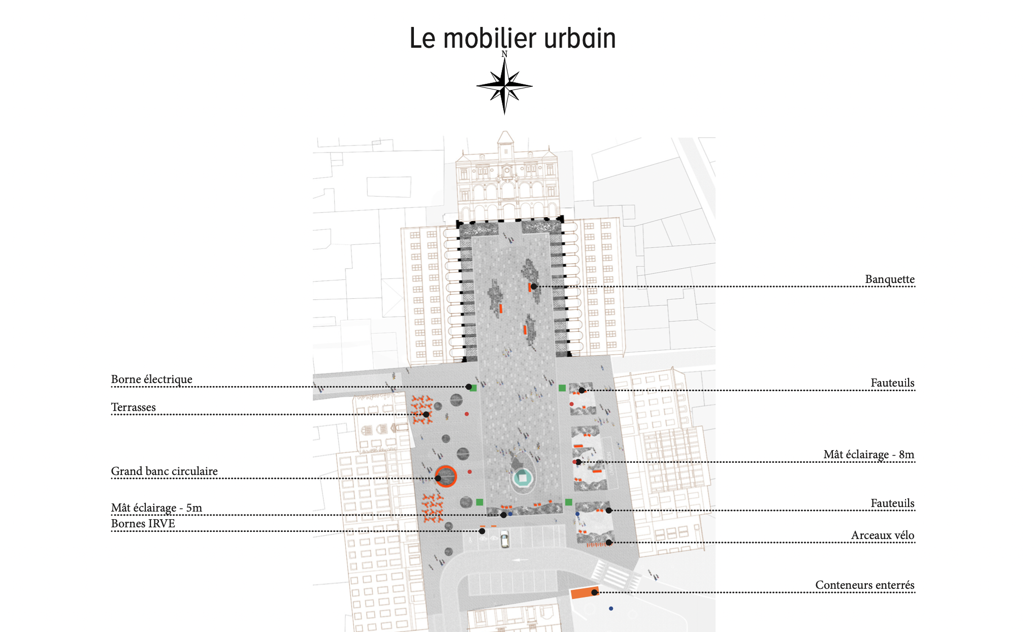 On verra ainsi apparaître des arbres, arbustes et massifs divers en de multiples endroits, tandis que du mobilier urbain design s’incrustera sur les deux places (voire plan ci-dessous).