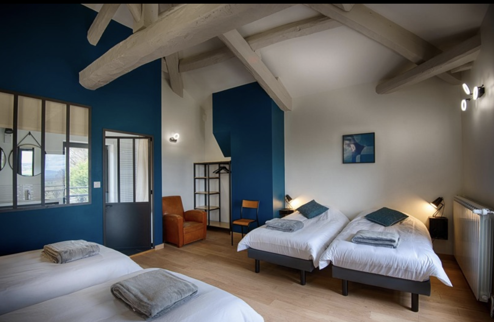 Et tout en haut au dernier étage de la tour, une chambre, évidemment panoramique située donc au sommet d’où vous pourrez admirer une vue imprenable à 360° de la campagne des Côtes d’Arey jusqu’au Massif du Pilat…