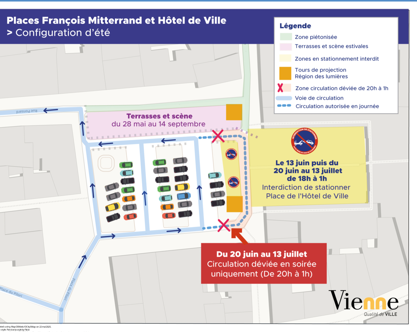 « Comme chaque année, la place François Mitterrand passe en configuration « été » avec un déploiement des terrasses et la suppression de places de stationnement du 28 mai au 14 septembre », annonce la mairie de Vienne.