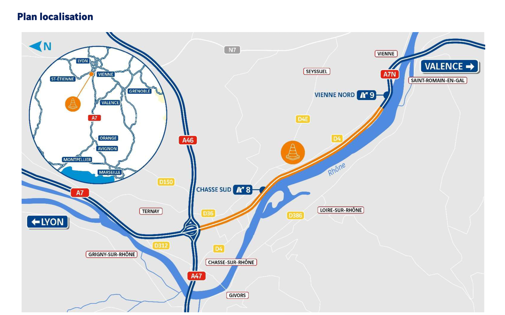 Engagés depuis plusieurs semaines, les travaux continuent sur l’A7 pour permettre à Vinci Autoroutes de déposer un nouveau ruban de bitume entre Vienne et le nœud de Ternay. Le concessionnaire autoroutier annonce ainsi que la bretelle de sortie Chasse sud (n° 8) en direction de Lyon sera fermée la nuit du lundi 6 au mardi 7 octobre, de 21 h à 6 h. À l’inverse, cette sortie sera obligatoire les nuits de mercredi 8 et jeudi 9 octobre avec la mise en place d’itinéraires de déviation.
