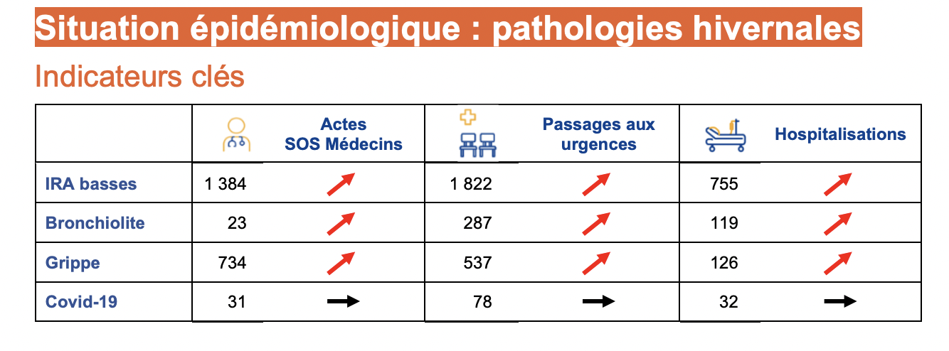 Pour la seule grippe, les indicateurs montrent 126 consultations pour syndrome grippal pour 100 000 habitants et un taux de positivité des tests grippaux, même « très supérieur aux saisons précédentes. «
