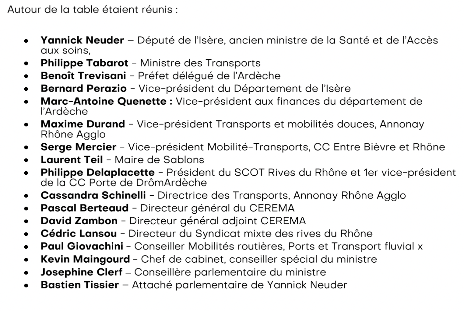 Une grande réunion organisée par Yannick Neuder, député de l’Isère et Philippe Tabarot, ministre des transports a relancé l’idée qui semblait être enterrée, d’un nouveau pont sur le Rhône, basé à Sablons/Serrières .Certes, cette réunion n’a pas décidé de la création d’un nouveau pont, mais de lancer un comité de pilotage du projet sous la responsabilité de la préfète de région Auvergne-Rhône-Alpes, Fabienne Buccio pour étudier la faisabilité d’un tel pont. Quatre départements feront partie de ce comité : l’Ardèche, la Drôme, l’Isère et le Rhône, tous quatre concernés par le gros problème de circulation dans la vallée du Rhône, mise en évidence actuellement notamment par la fermeture actuelle du pont de Condrieu.