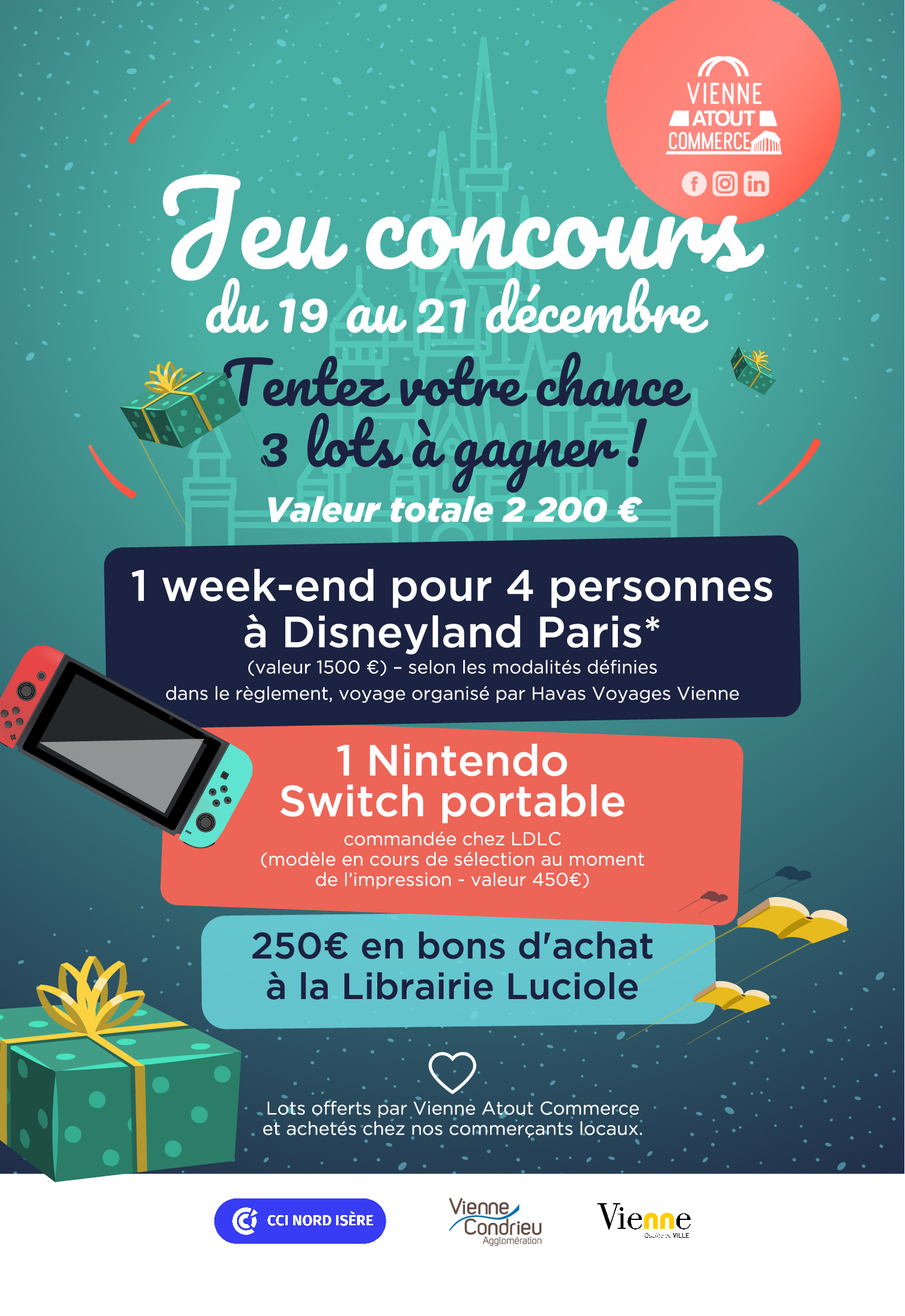 Et enfin, pour les plus grands, vous retrouverez chez vos commerçants du 19 au 21 décembre un jeu concours exceptionnel avec 3 lots à gagner dont un séjour à Disneyland !