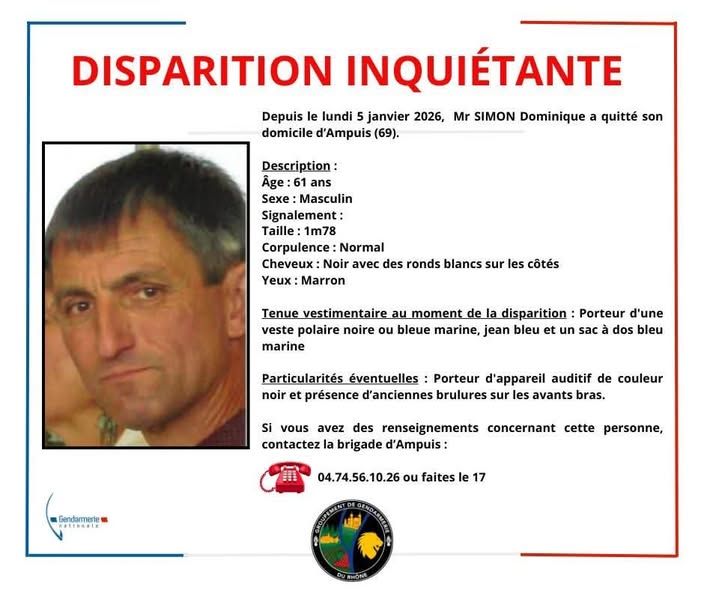Il a quitté son domicile mardi 5 janvier vers 13 h 30 à Ampuis, à pied avec un sac à dos, et n’est pas rentré depuis..