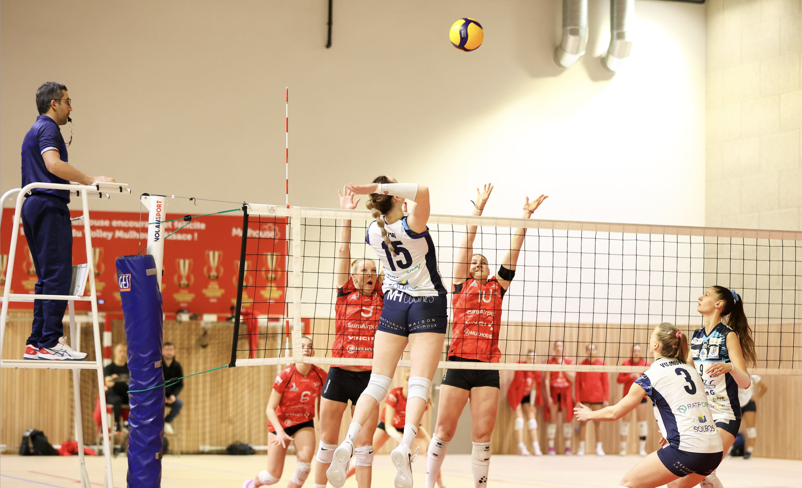 Piquées au vif, les Mulhousiennes ne s’en laissent pas compter et retrouvent leur niveau en emportant assez largement le 2ème (25-19), puis à l’arraché le 3ème set (25-23).