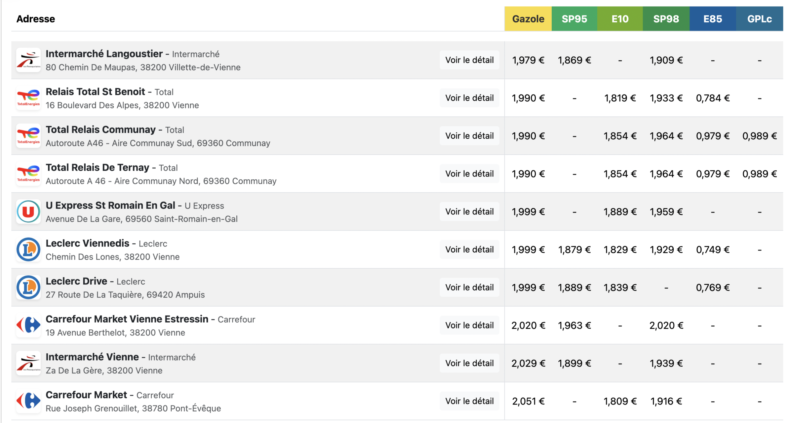 Les prix de l’essence dans le Pays Viennois et alentours ce vendredi 13 mars (site mon-essence.com) :