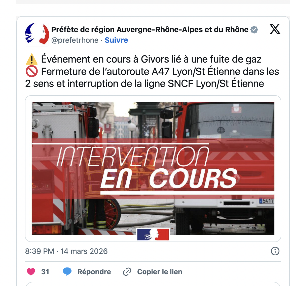 Ce samedi 14 mars en soirée, une fuite de gaz a été détectée sur le territoire de la commune de Givors, amenant un important dispositif de sécurité: la circulation sur l’A47 et les liaisons SNCF ont été interrompues.