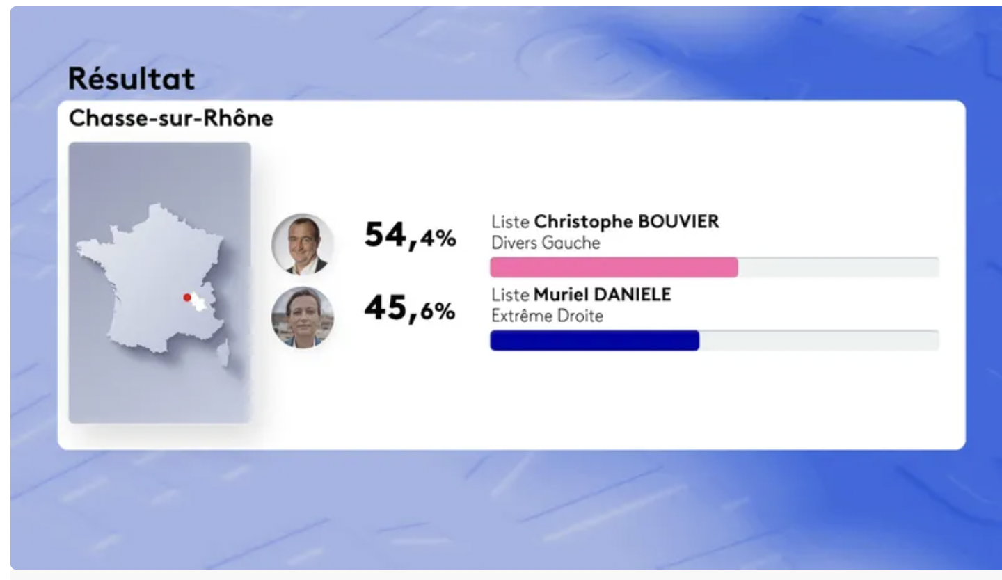 Cette victoire permet au maire sortant de Chasse-sur-Rhône de décrocher 23 sièges au conseil municipal et donc de retrouver son fauteuil.