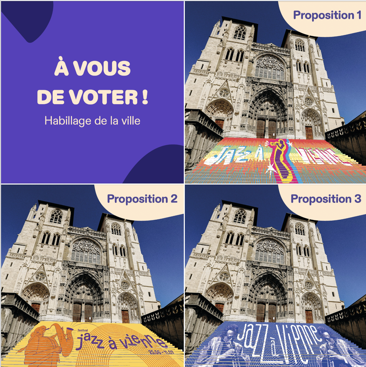Une nouvelle fois dans le cadre de Jazz à Vienne, les contremarches de la cathédrale Saint-Maurice seront habillées aux couleurs de Jazz à Vienne pendant le festival. Il y a trois propositions, à vous de choisir en votant (photo)