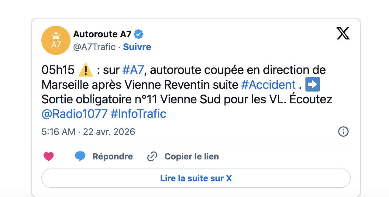 L’A 7 a été ce matin au Sud de Vienne le cadre d’un spectaculaire et dramatique accident. Il était aux alentours de 5 heures lorsqu’un poids lourd s’est renversé en ce mercredi 22 avril sur l’A7 à hauteur de Roussillon entravant la chaussée. Par conséquent, l’autoroute est coupée en direction de Marseille. La sortie Vienne-Sud est obligatoire.